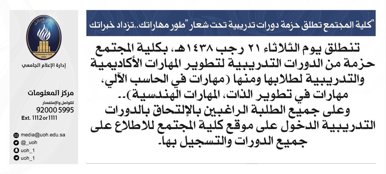 جامعة حائل Pa Twitter كلية المجتمع في جامعة حائل تطلق حزمة من الدورات التدريبية لطلبتها تنطلق غدا Https T Co Ulc2pxyxur